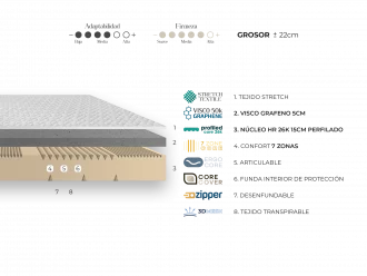La capa de viscoelástica de 7 cm aporta una adaptabilidad excelente, permitiendo que el colchón se amolde al contorno del cuerpo y reduzca los puntos de presión en zonas clave como la espalda y las caderas. Cuanta más viscoelástica, mayor es la capacidad de adaptación, lo que se traduce en una experiencia de descanso personalizada y sin interrupciones.