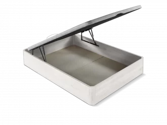 El sistema de elevación mediante hidráulicos facilita una apertura suave y cómoda, mientras que el fondo del arcón en melamina apoya directamente sobre el suelo, mejorando la estabilidad. Incluye dos patas esquineras frontales y tirador uñero embutido para una estética limpia y funcional.