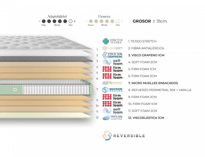 Matalàs multicapa amb teixit stretch, fibra antial·lèrgica, viscografè, diferents densitats d’escumes i micromolls ensacats per a un descans còmode i amb bon suport.